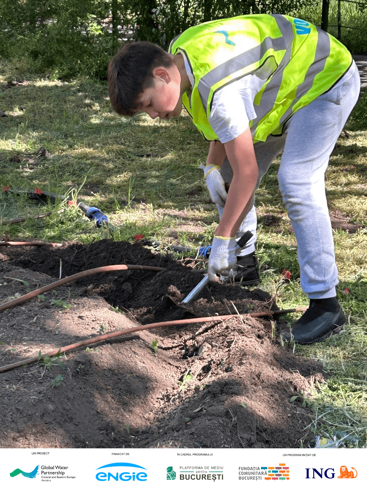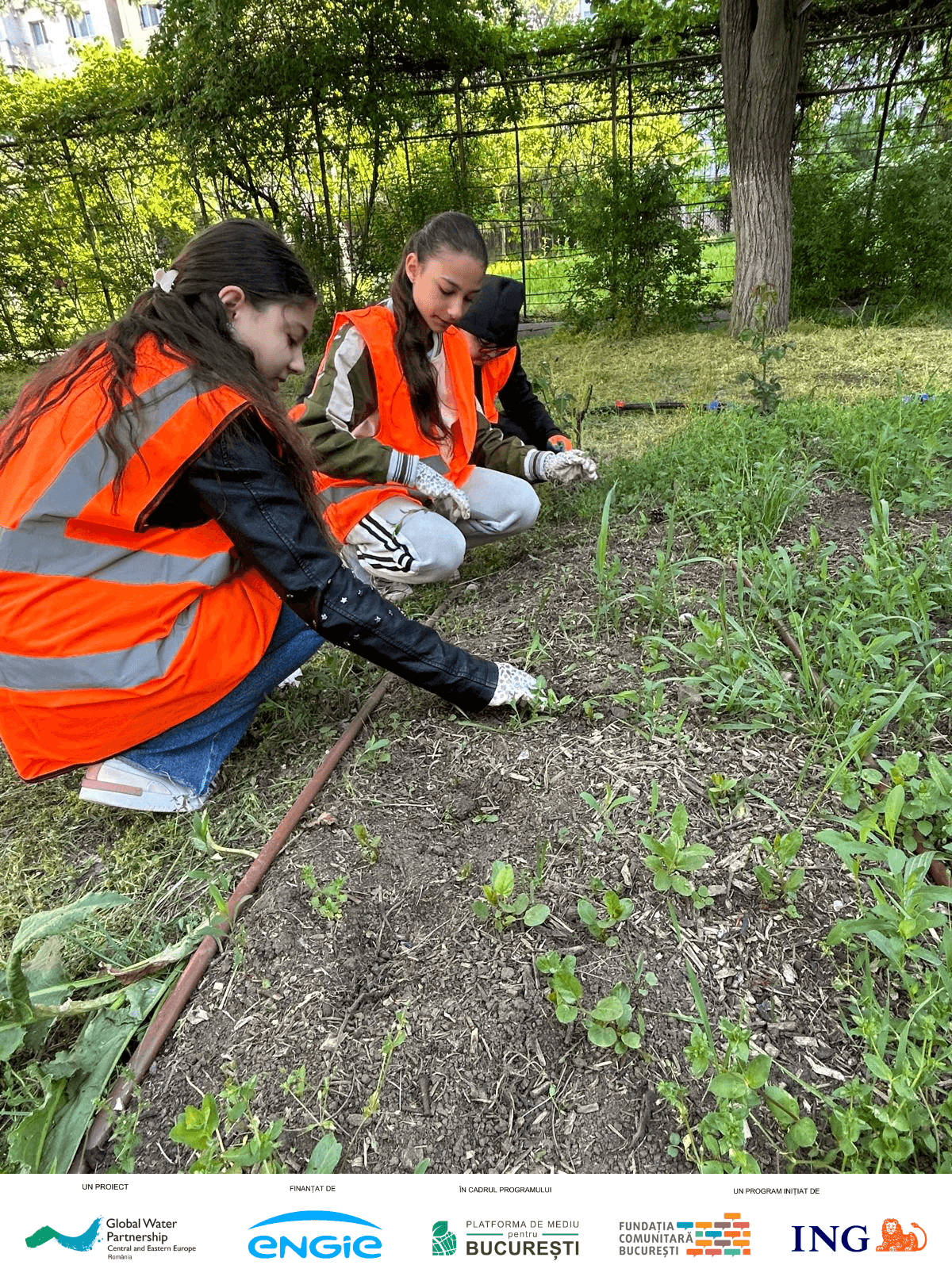 ✔ Pregătirea solului – Echipe formate din elevi, părinți și personal auxiliar, au curățat terenul, iar voluntarii au realizat decopertarea în zona destinată viitoarei alei. Elevii au ajutat la împrăștierea compostului pentru îmbunătățirea solului și au fost implicați activ în montarea țărușilor și întinderea frânghiei de delimitare, pregătind astfel terenul pentru următoarele etape.